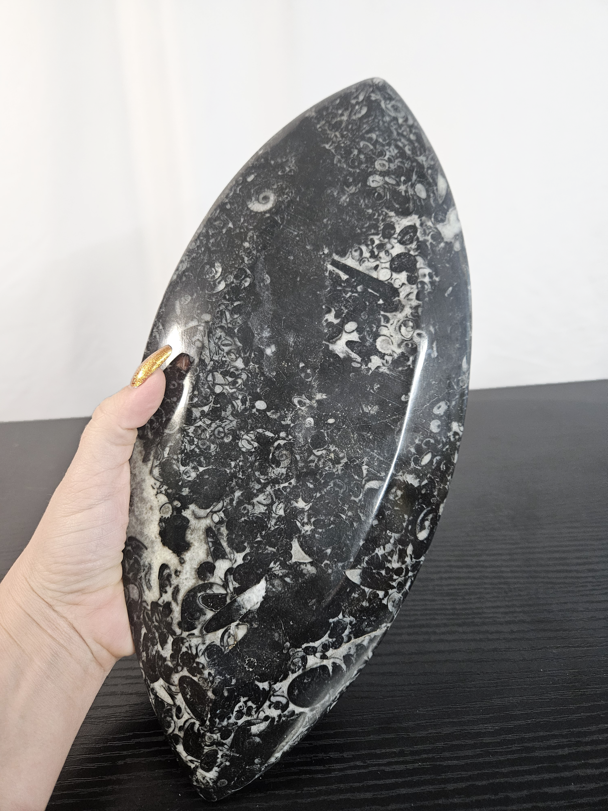 Carved from stunning Moroccan fossil stone, this sleek Orthoceras Fossil “boat” tray is a functional statement piece for any altar, nightstand, or sacred space. The dark matrix is naturally filled with ancient fossil impressions, and the center features a polished Orthoceras fossil—creating a one-of-a-kind piece that feels both earthy and timeless. Use it as a catch-all for jewelry, a mini altar base, or a display dish for your favorite crystals.